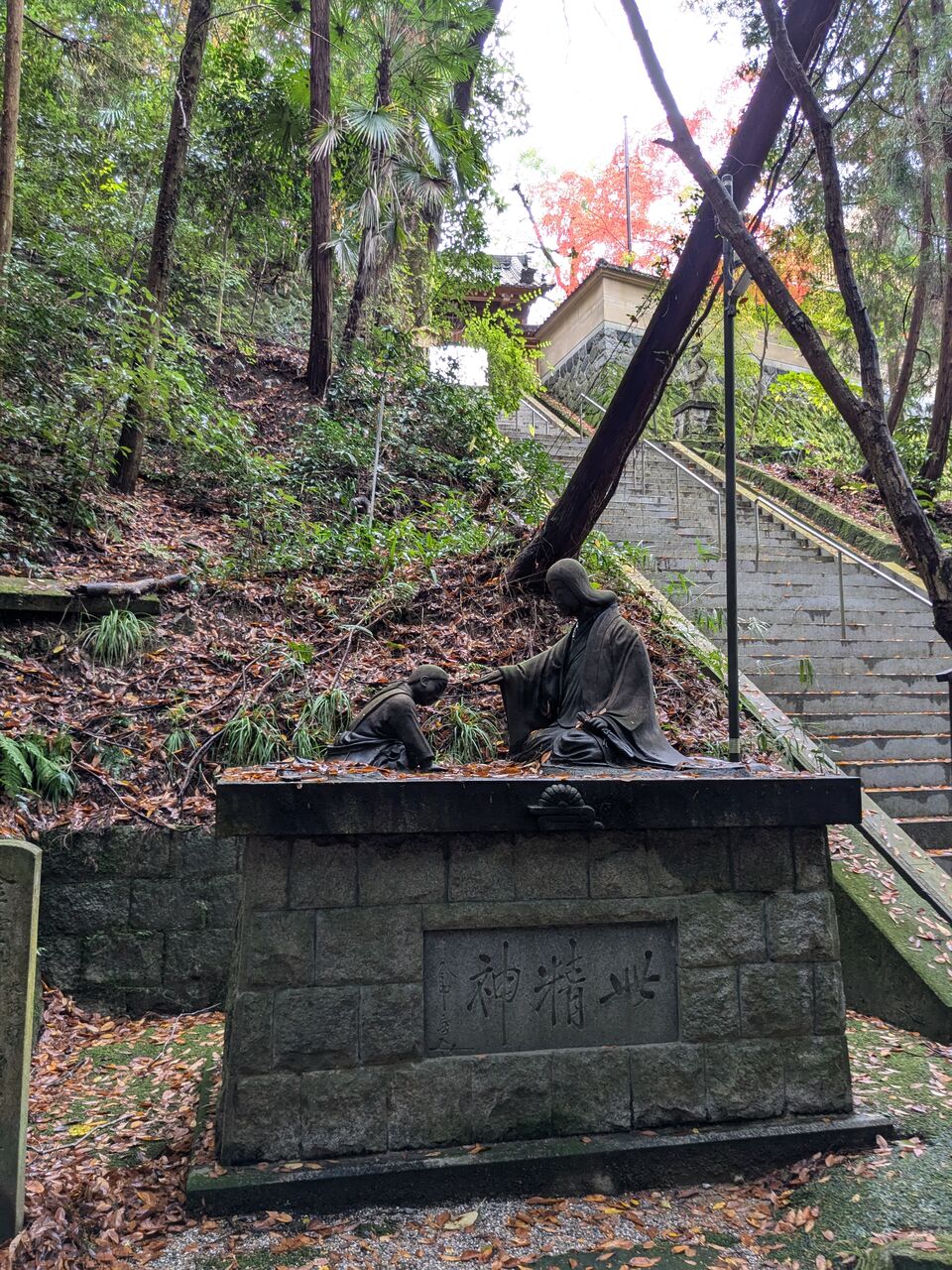 楠木母子の像 久子夫人が楠木正行(まさつら 通称 小楠公 楠木正成の長男)を持仏堂で訓戒している像です。