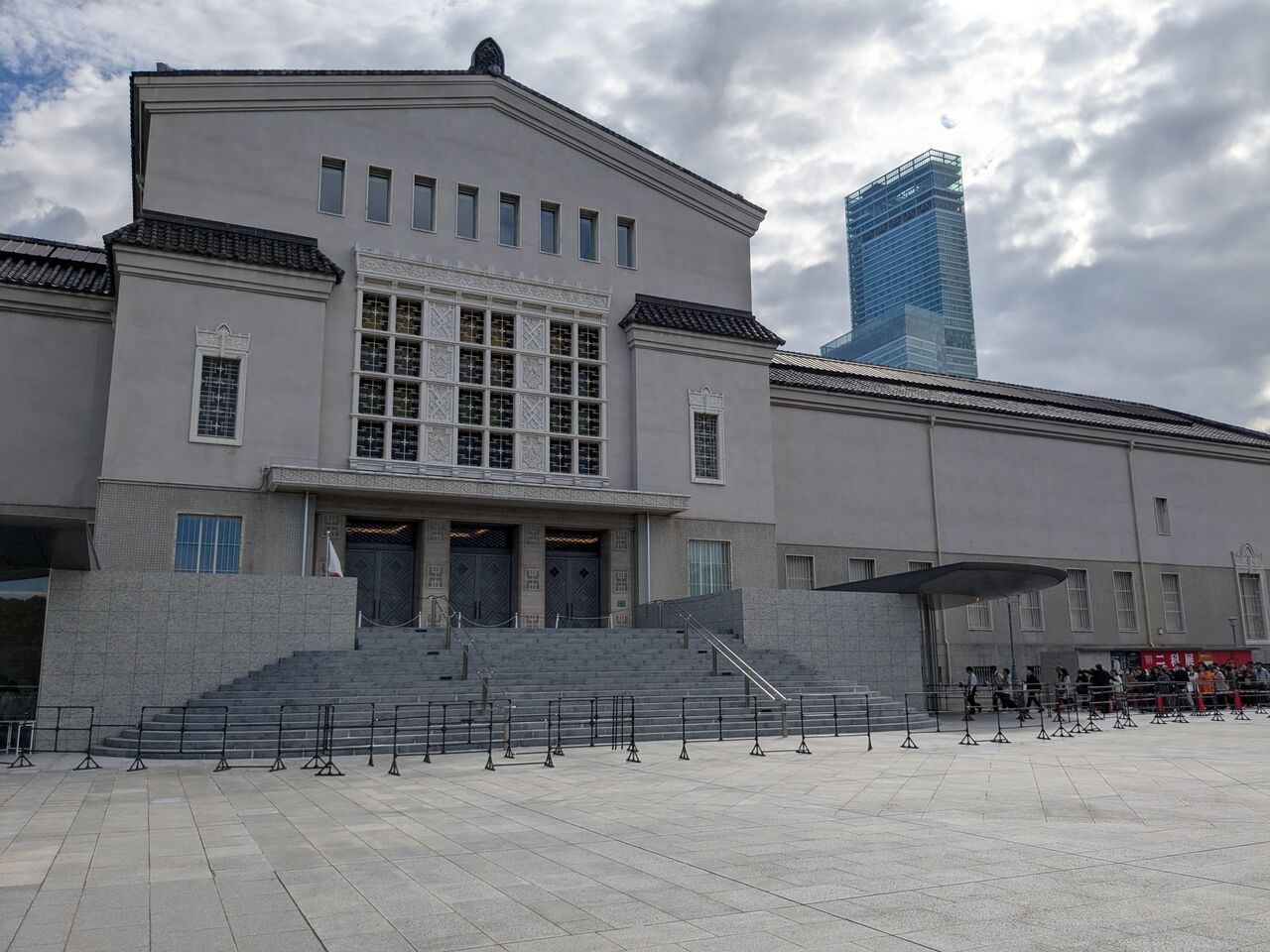 大阪市立美術館は耐震補強工事等で、今年の春リニューアルオープンしたばかりです。右手後方にあべのハルカスが見えます。