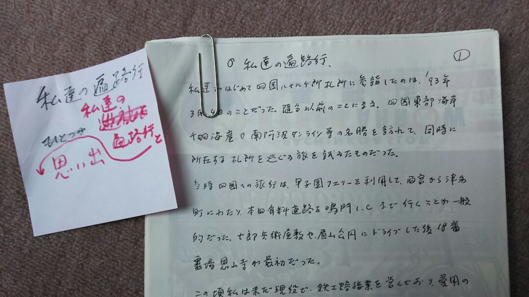 特に昨年4月にこのブログで発表した「私達の四国遍路行と思い出」の文章は、特に気に入っていたようで、自分自身の自筆原稿を、入院している病院に持ってきて欲しいと頼まれ、遺品を片付けた際に、ベット脇の私物入れの中から、自宅に持って帰りました。そのブログは、下記をご覧下さい。