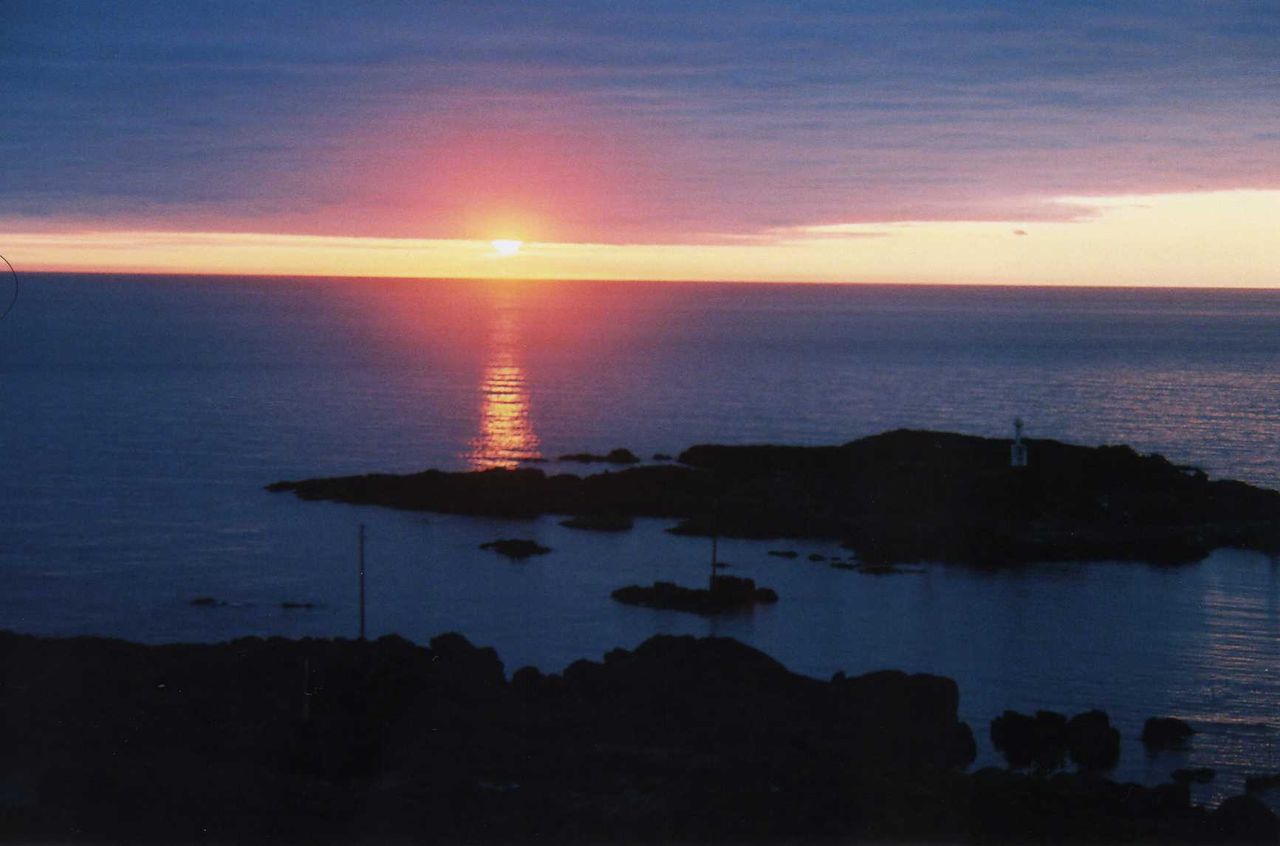 午後6時45分、目指す戸賀温泉(男鹿)帝水に到着した。日本海は厚い雲に覆われて、とても7時6分の日の入りは望めないと思っていたが、海上と雲の間に僅かな隙間が出来て、幸運にも神々しい姿を見ることが出来た。