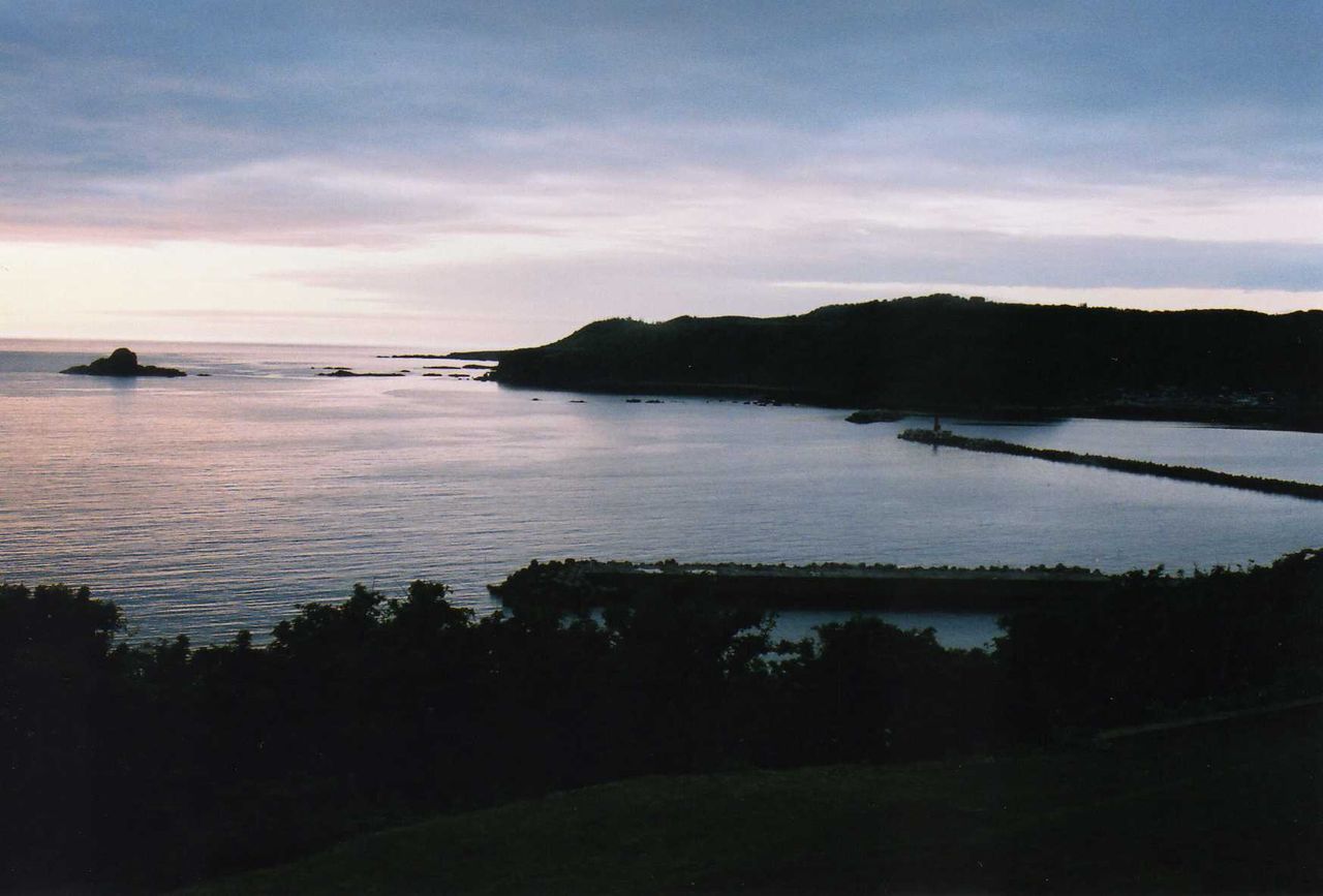 旅館から迎えのバスが来て、午後5時25分に出発。海と入り日の宿、帝水(2013年11月閉館)に向かう。男鹿半島入口から国道101号を海岸線に沿う。薄暮の日本海は波穏やかな様子である。羽立信号から県道59号線に入る。帆掛け岩等を望んで更に進む。岩場は道路直下、崖下に点在しており、車中からの観光は不可能である。