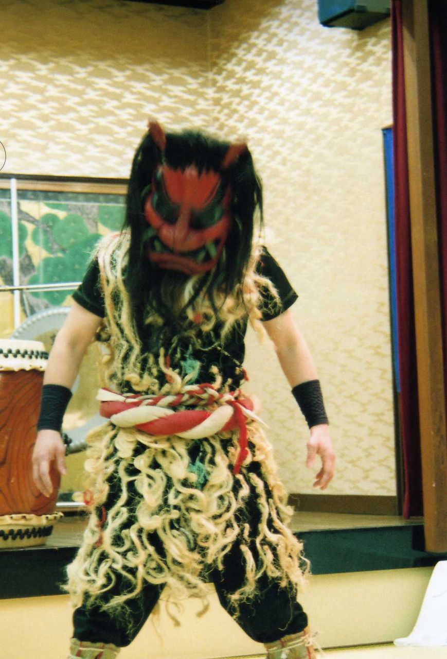 恐ろしい形相の鬼(なまはげ)の面を被り、藁(わら)製の蓑(みの)や脛巾(はばき 管理人注 脛に巻き付けるもの 後世の脚絆(きゃはん)に近い)を着けて、師走の三十一日夜、木製の出刃包丁を携えて突然現われる、秋田の民俗行事をショー化したもので、目の覚めるほど大きな太鼓の音に調子を合わせて踊り狂うのである。ツアーの客から大変な喝采を博していた。