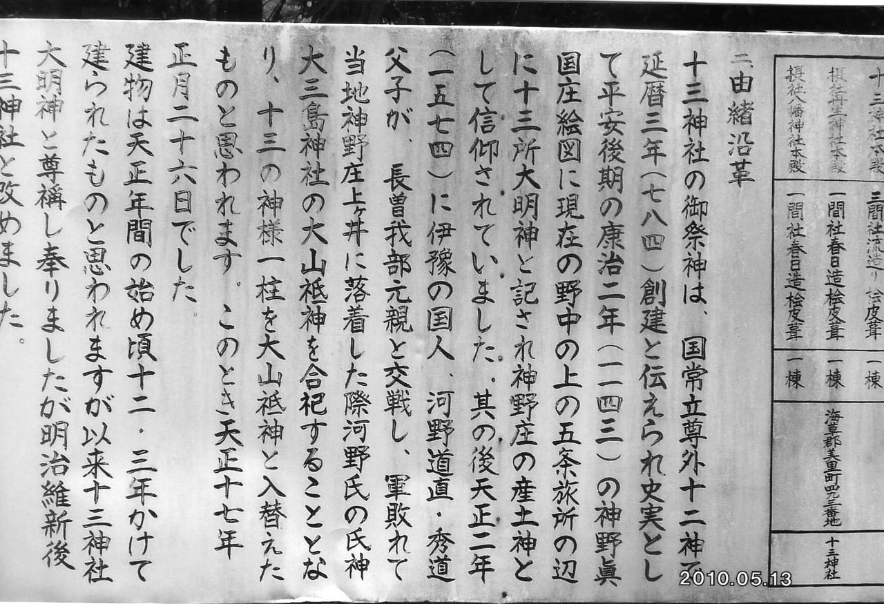 現社殿は桧皮葺きの本殿の他、二棟、計三棟からなっている。国の重要文化財に指定された堂々としたもので、1200年の歴史を感じさせる立派なものだった。合計して十三の神々を祀ることから、この名前がつけられたそうである。