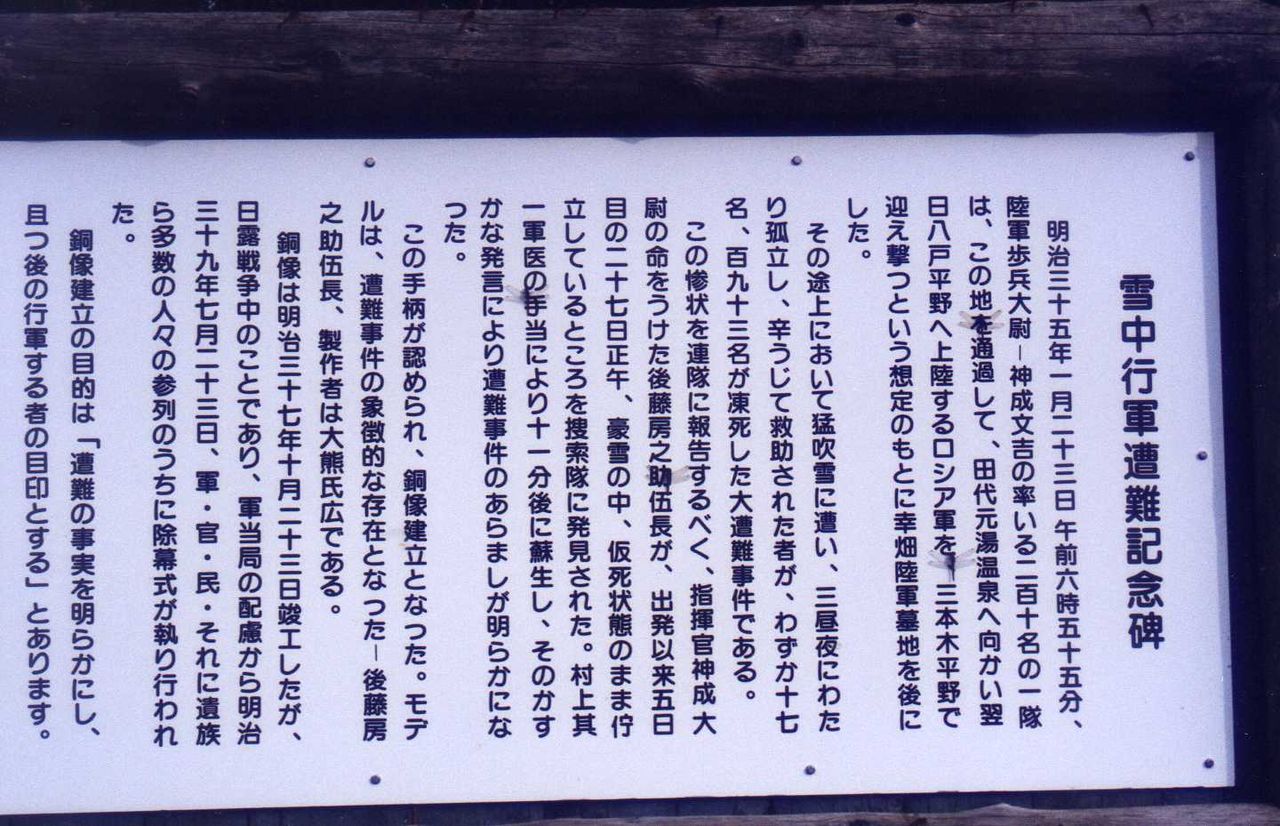 十和田ゴールドライン(国道103号)を外れて、八甲田山周遊道路北側の丘陵地にある雪中行軍遭難の地に向かう。ブナの多い樹林帯である。現在はさほどでもないと思われるが、明治の頃の1月である。猛吹雪に5メートル以上の積雪、200名の犠牲者が出る悲劇が起こったのだ。