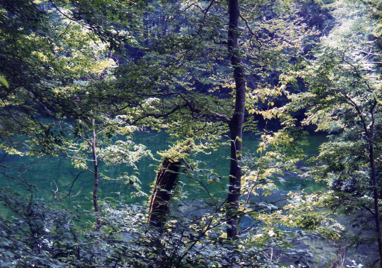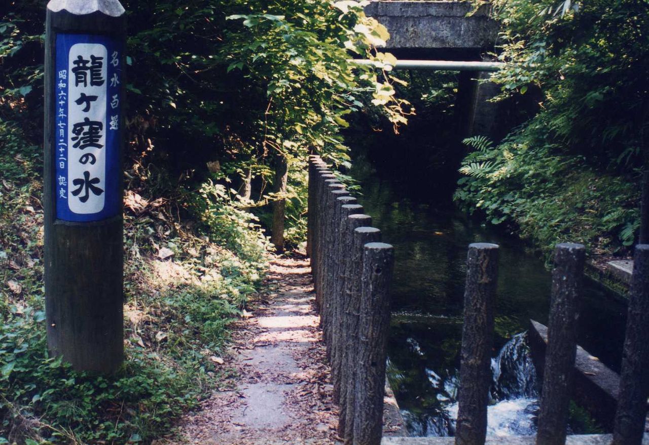 国道117号線、中津川橋手前を右折して、日本の名水100選に指定されている龍ヶ窪に行く。駐車場からブナ、ミズナラなどの茂った道を森に入ると、周りの木々を水面に映し、水草も透けて見える神秘的な池に行き着く。広い池であるが、この池の水が1日で入れ替わるほどに豊かな水が湧き出しているらしい。薬師さんがお祀りしてあり、私達も冷たい水をいただいた。