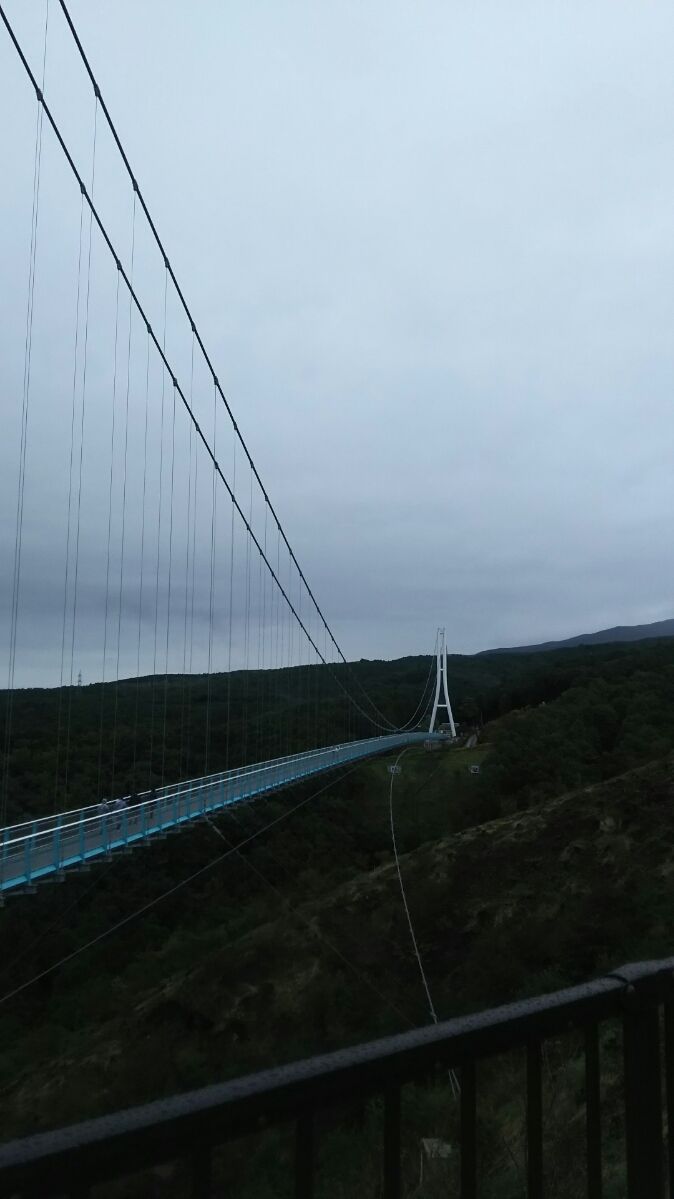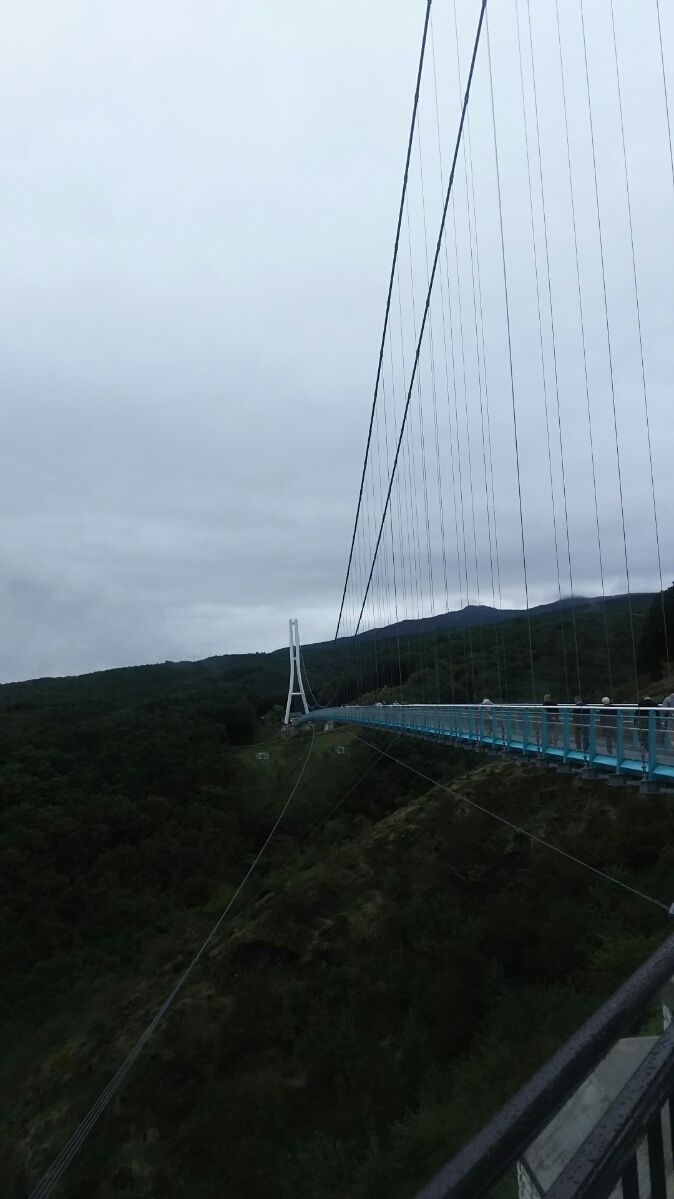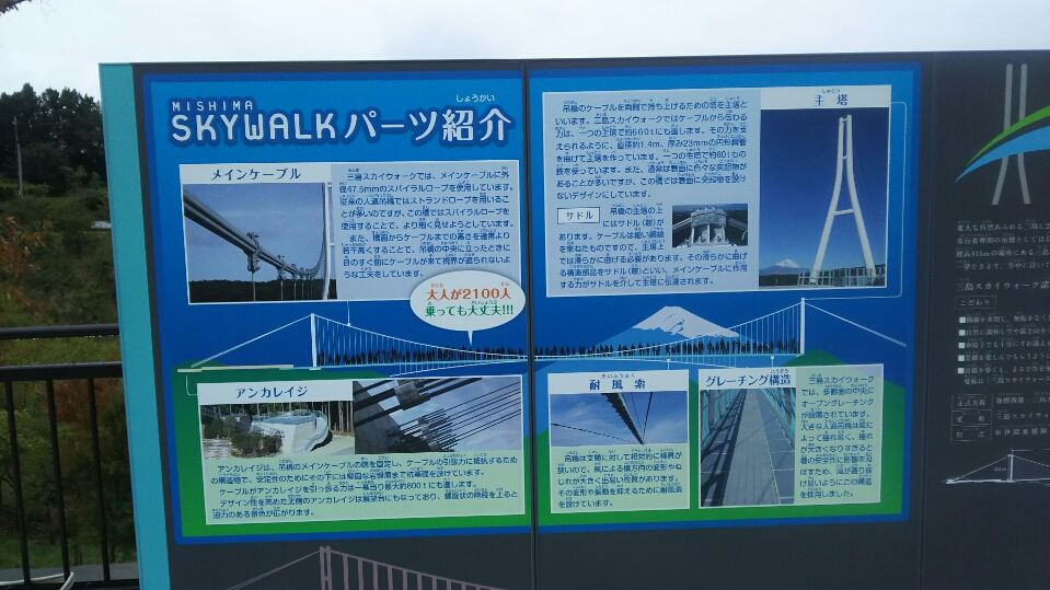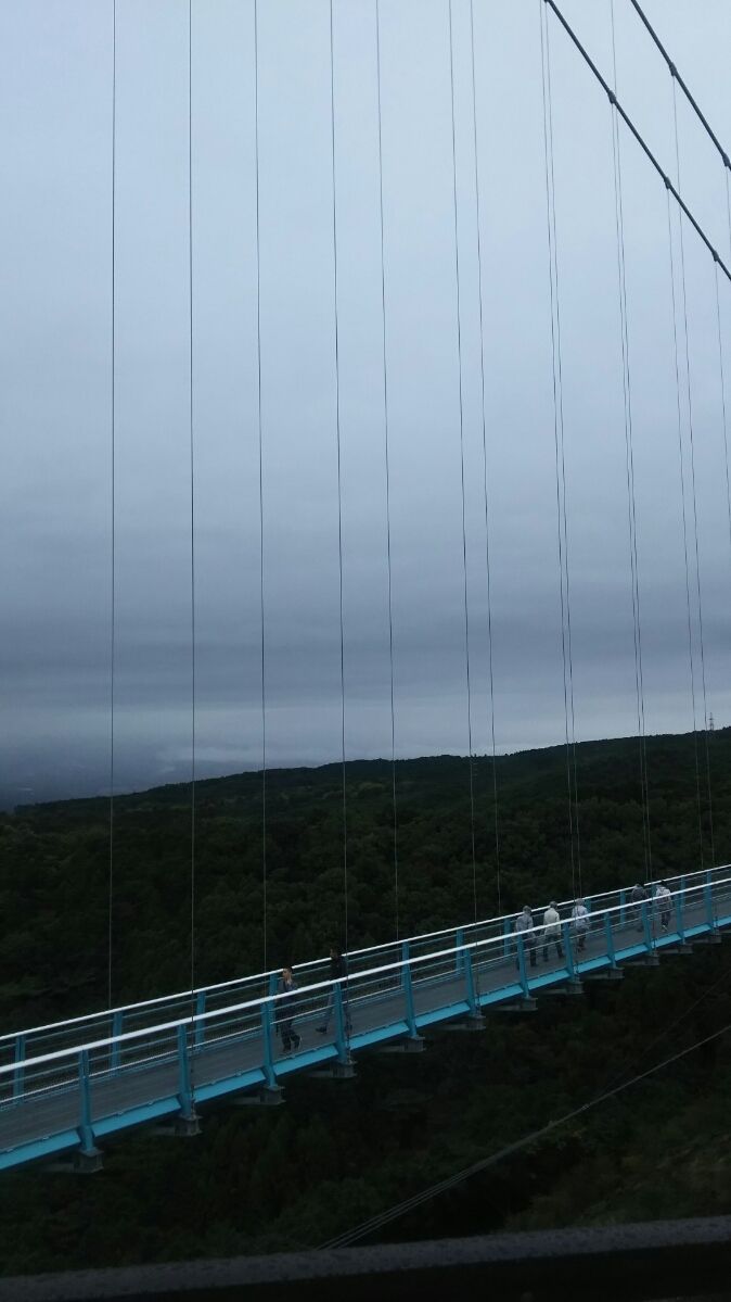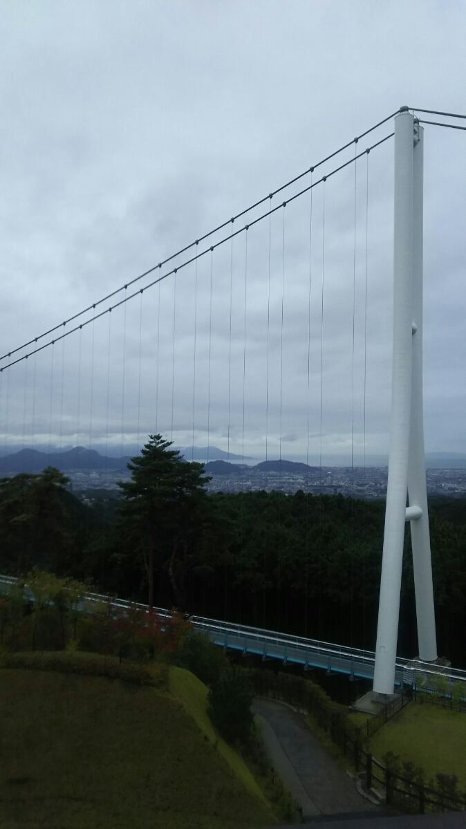 その後三島スカイウォークに移動。ここは全長400メートルの、歩行者専用としては日本一長い吊橋です。富士山、駿河湾が一望出来る絶好のスポットです。(ただし、晴れていれば)橋の上では傘を差すことが禁止されているため、カッパを着て、橋を渡ります。