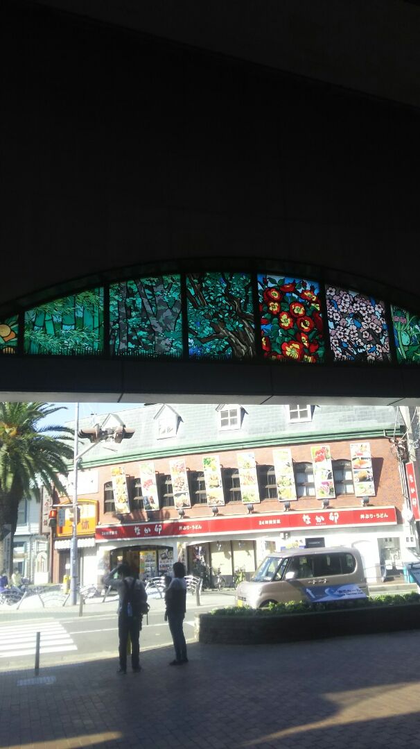 岸和田駅にやってきました。西出口のステンドグラスの図柄が、またもやパズルのヒントになっているので、暫く上を見て眺めています。
