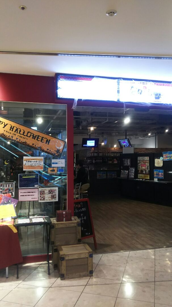 犯人は分ったものの、それ以外は分らないまま、回答提出所のなぞともカフェへ。なんばパークスの6Fにあり、アミューズメント運営のナムコ経営で、全国にも多数店舗があります。なお、なんばパークスは2003年に、かつての南海ホークスの本拠地、大阪球場跡に建てられた複合施設です。(オールド野球ファンの人にとっては、いまだに聖地です。)