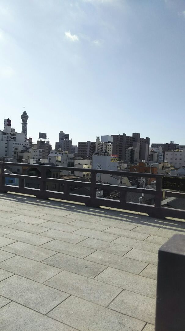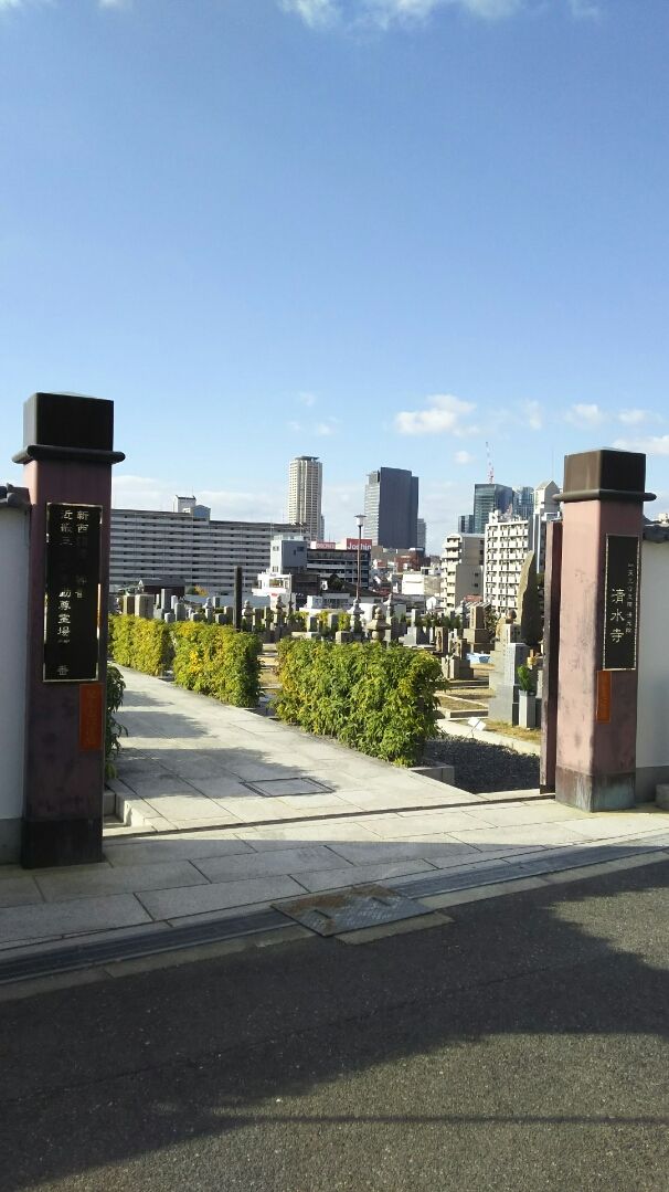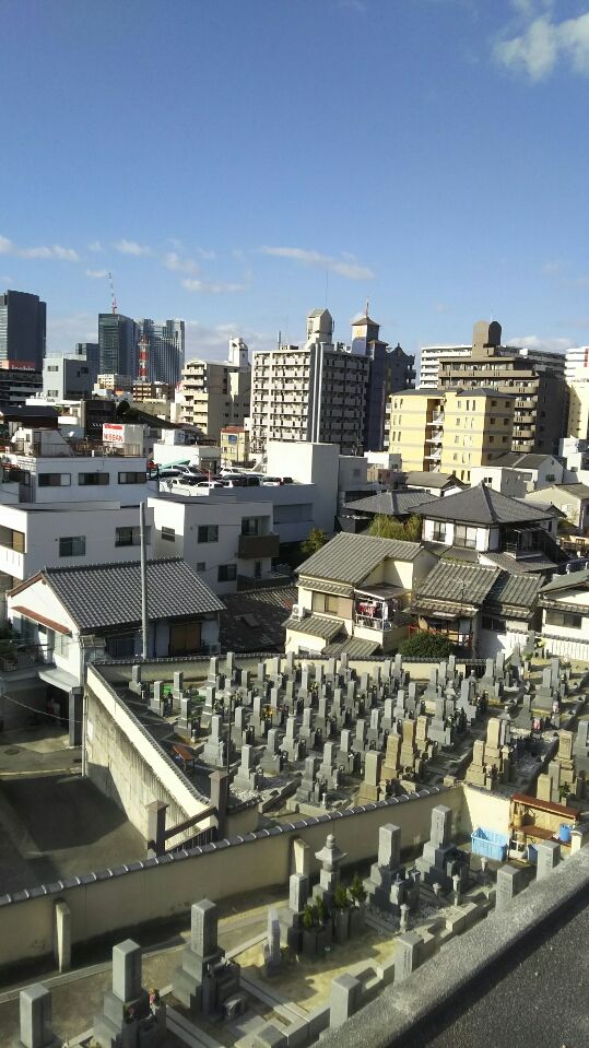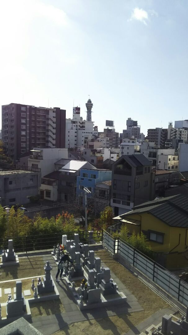 このお寺の舞台からは、通天閣が見えます。下に写っている墓地もこのお寺の管理地です。