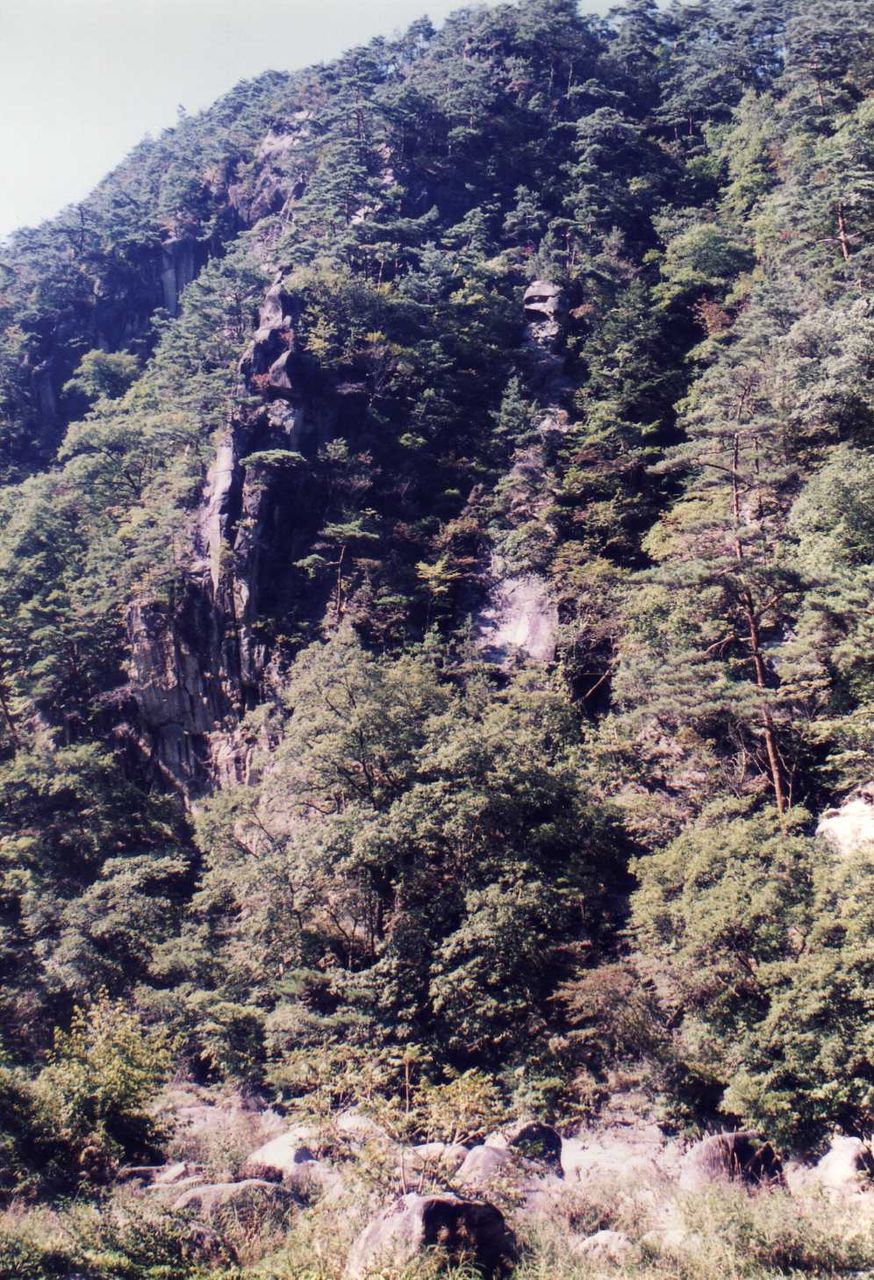 甲府昭和インターチェンジを出たのが1時前。時間的に余裕があるので、予定を変更、昇仙峡に向かう。入口から流れに沿って渓谷を行く。ずんぐりむっくりの岩が大変多い。岩をおおうように赤松が繁って、少し変った景色が見られた。亀石、火砲岩、富士岩などとそれぞれに名称がつけられている。奈良県の香嵐渓(こうらんけい)と少し感じが似ていると思った。登竜岩と名付けられた立派な絶壁の岩を見た後、約1キロメートルで羅漢寺である。