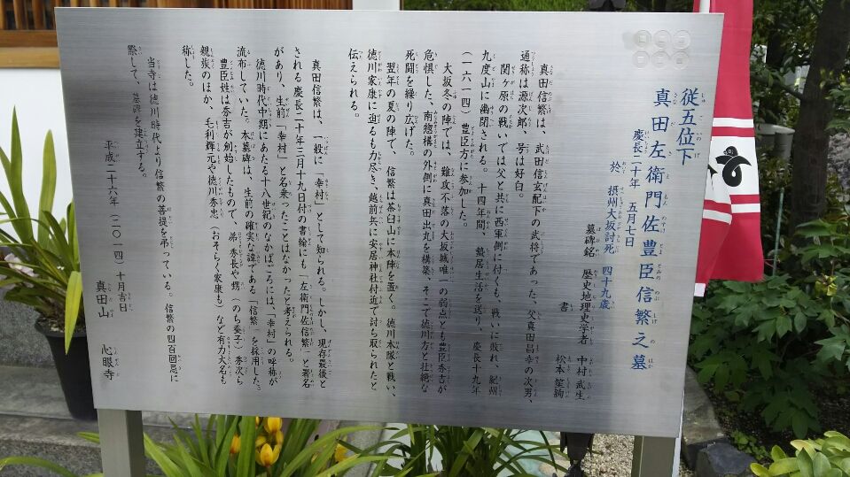 三光神社を出て、数分、西に歩いて、左に曲がり坂道を上っていくと「心眼寺」に到着します。この一帯は、まさに真田丸があったといわれる一帯です。山門には「真田幸村出丸城跡」の石碑があり、境内には幸村の墓があります。この心眼寺は幸村と息子・大助の供養のため、真田家の子孫によって、江戸時代に建てられたものです。