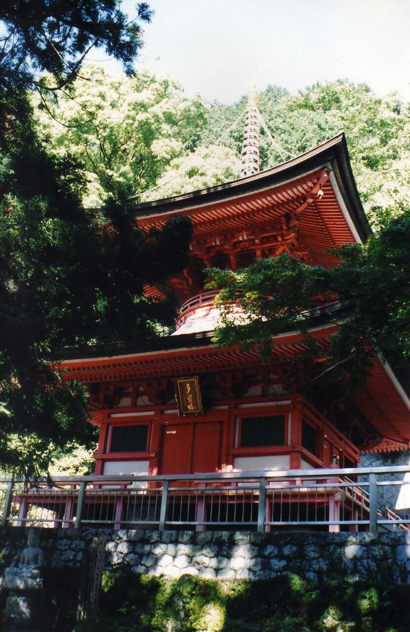 山上駅を降りてお土産店を抜け、樹木の多い参道を行くと右手に二層の多宝塔が見える。建立から20年くらいの新しい塔であるが、姿も美しく朱の色がとても目立つ。日曜日であるが、お参りの人は大して多くなかった。