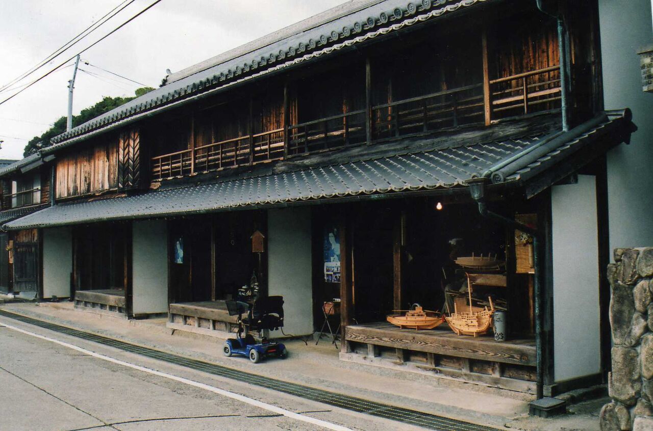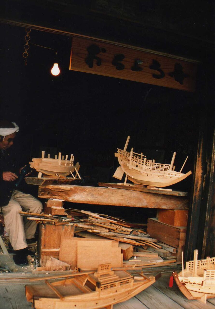 海岸線につくられた堤防に沿って、道路が町の中心部に展開する。道路に面してすぐ目に入るのは、江戸の船宿である。旅館というより仲買問屋だったとマップに記している。現在、元船大工の宮本さんが、遊女を乗せて沖の船まで運んだという「おちょろ船」「北前船」の模型を再現しているが、船宿跡の一部を作業所にしている。「売春禁止法が出来るまで、この船は使用されていたのです。」と説明してくれた。床の低い店前や二階の構造が特徴だった。