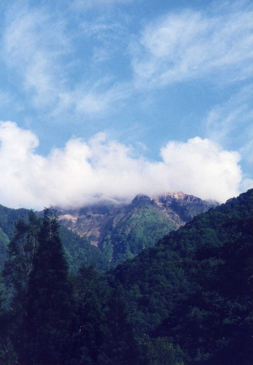 住職のアドバイスを受けて、中尾温泉に行く。ここは旅館というより、会社の保養施設風のものが多くて、実に閑静なところである。そこここに温泉の吹出し口があって、硫黄の臭いが強い。車輌立入禁止の地点まで行った。焼岳は活火山であり、立入は禁止されている。結局、下の温泉まで引き返して焼岳を望んだが、赤茶けた岩肌の山頂付近から、白煙を吐いており、恐ろしい感じがした。この地点、焼岳の北側からの眺めは男性的だと思った。中尾温泉からかまたがわを挟んで反対側、北側に錫杖岳があった。太陽の光線の具合ですっきりした姿は見えないが、その聳え立った見事な岩壁。素晴らしいの一言に尽きる。新穂高ロープウェイ乗り場まで行って引き返す。