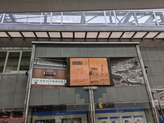 伏見桃山駅近く おかやまっさんカラクリ時計 13時から19時までの定時に扉が左右に開き、キャラクターが表れる仕組みになっています。ユーチューブにカラクリが開く場面を投稿されている方がいるので、興味のある方は探して下さい。