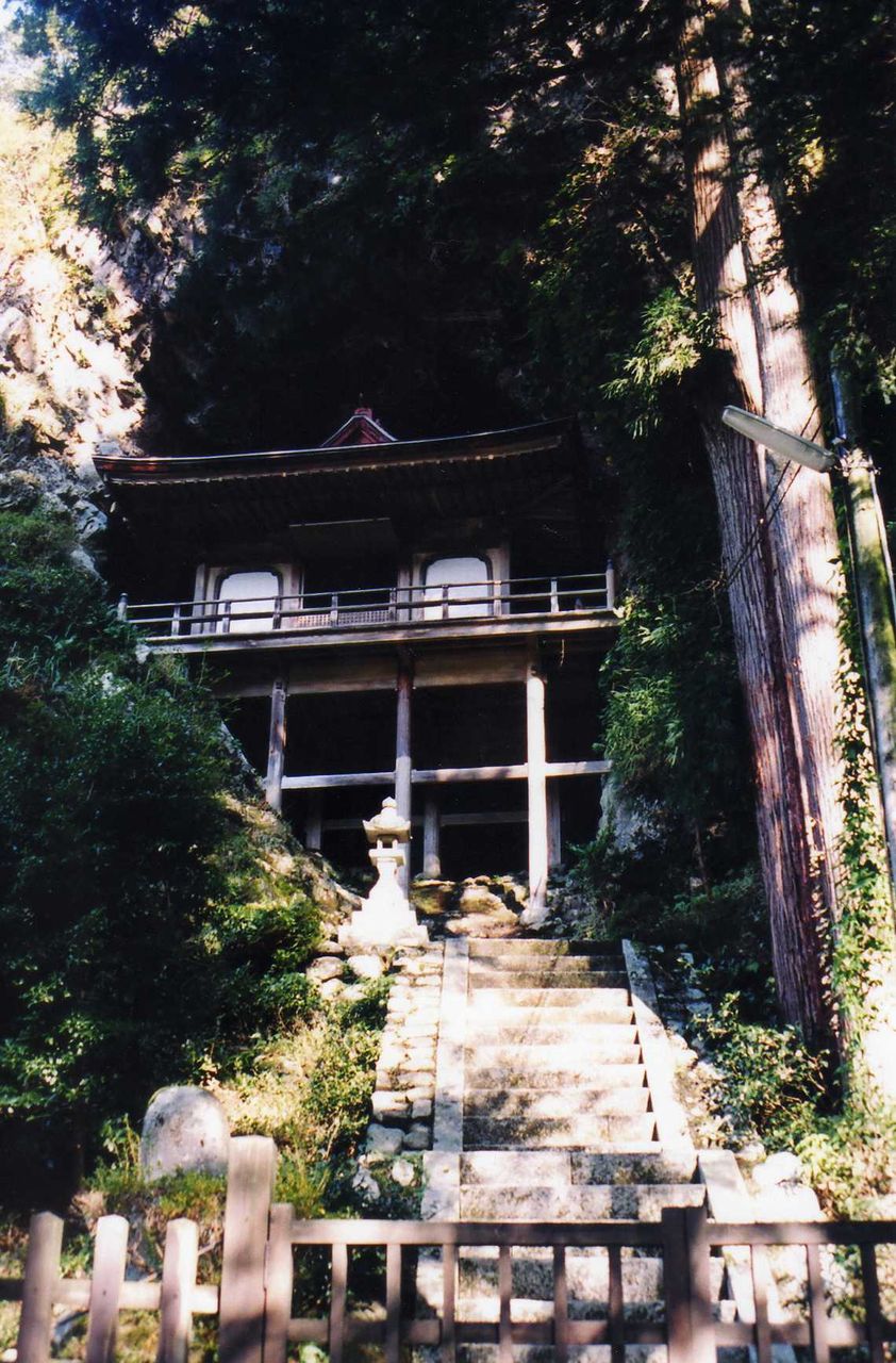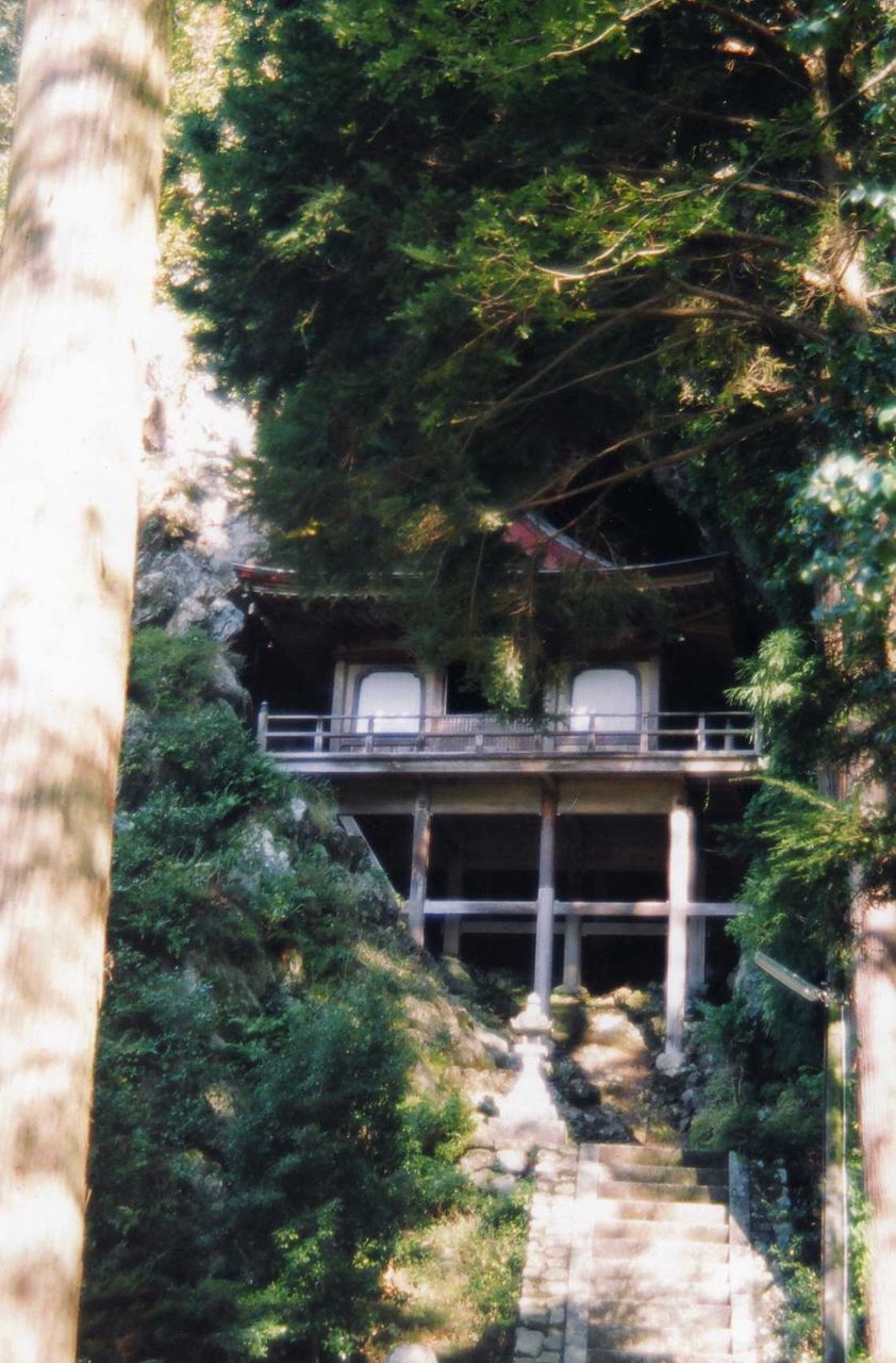 お堂は十数段の石段を上った上に、更に約10メートルの高さで足柱が組まれ、舞台の上に建っている。三朝の投入堂の場合は、山を登らなければ行けなかったが、此所は石段下からお詣り出来た。石段の登り口は、鉄の扉で塞がれていた。