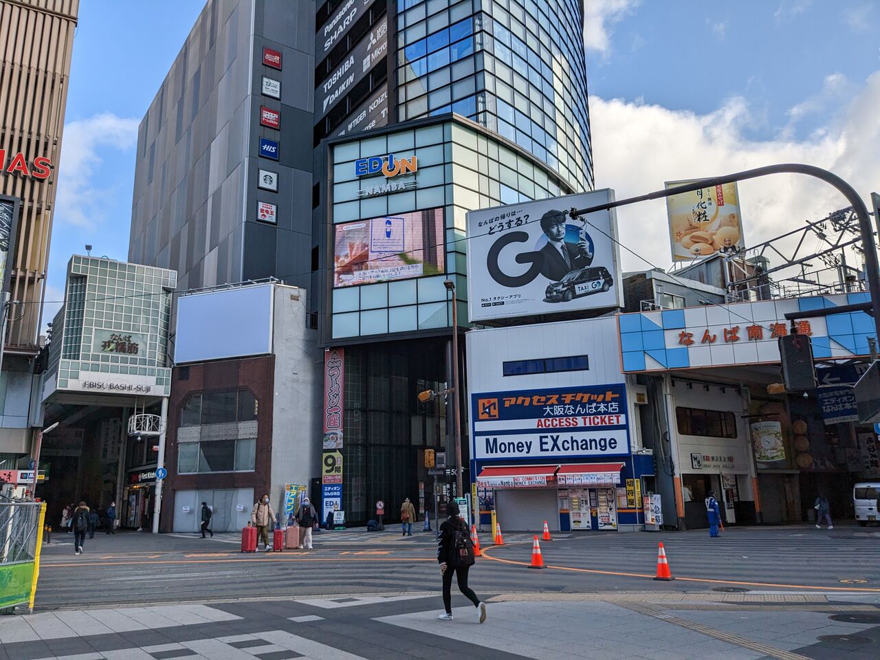 駅前は午前8時台で閑散としています。左の「戎橋商店街」は北に向い、しばらくするとグリコの看板があります。右の「南海通り」は東に向います。中央の高い建物はエディオン難波店です。