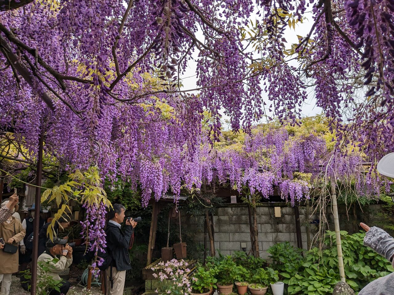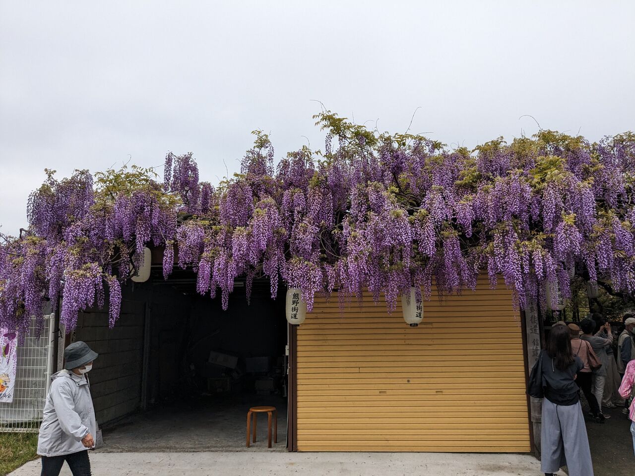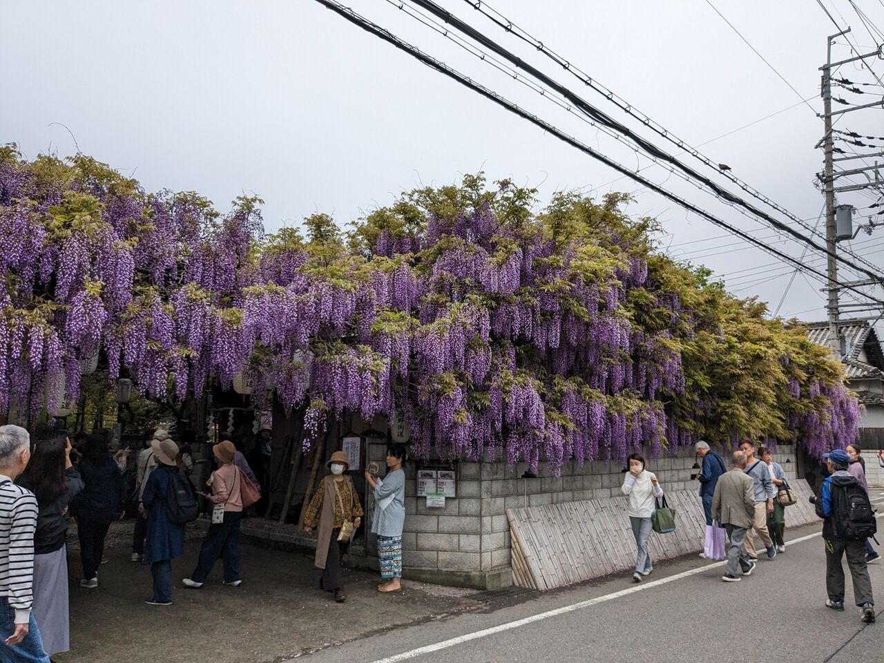 大阪府泉南市の熊野街道信達(しんだち)宿は、かつて大阪から熊野三山詣での宿場町でした。この場所に、故梶本昌弘氏が育てた1本の野田藤が4万房を超えるほどに成長しています。公共の場ではなく、現在も梶本氏の家族がお住まいの個人宅とのことです。しかし、年に2週間ほどの短い期間ですが、一般の方を受け入れられています。