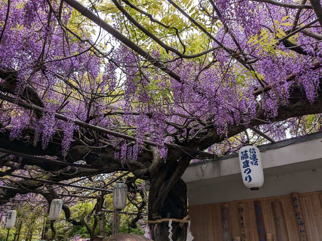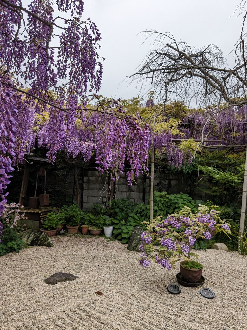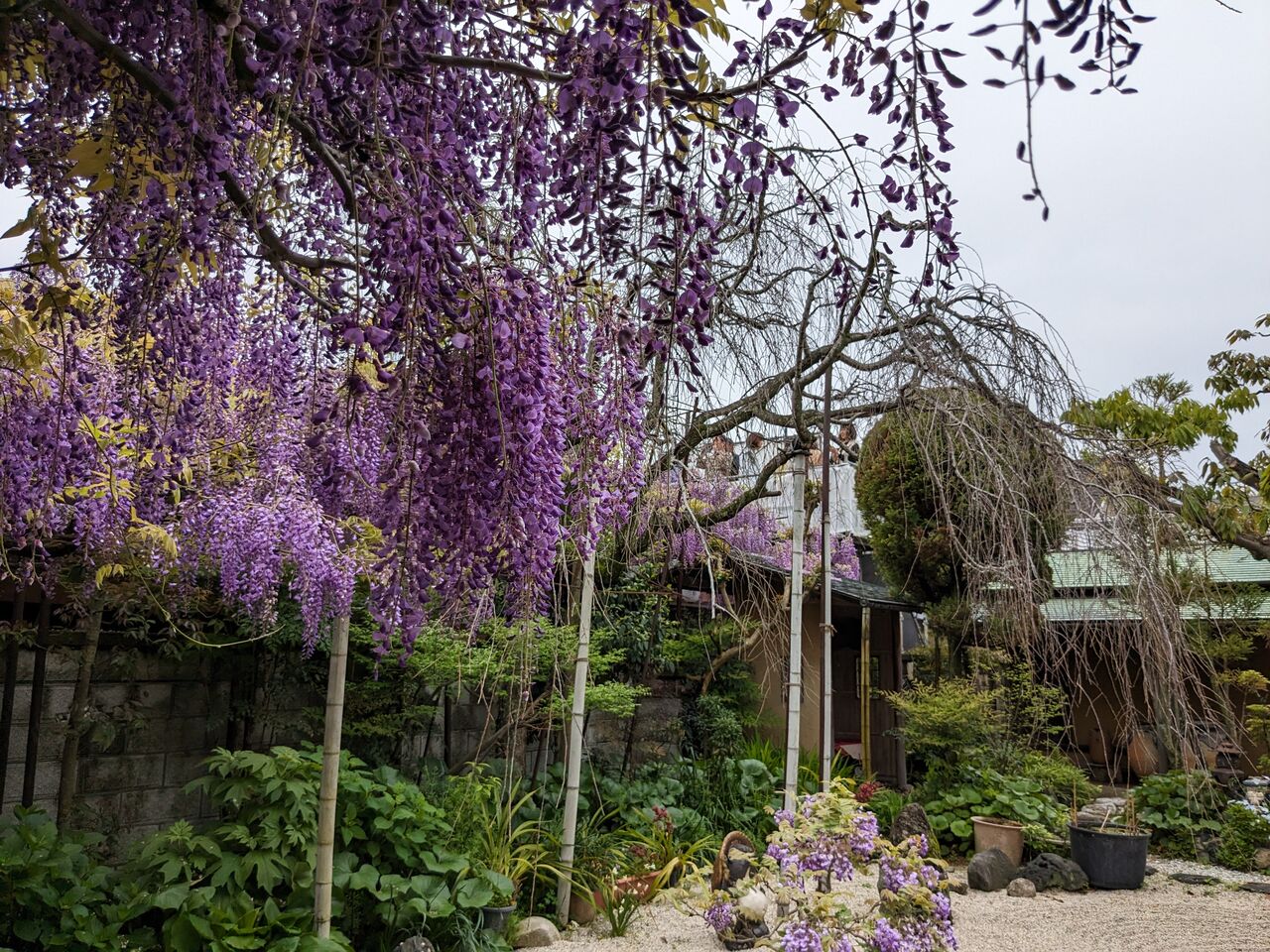 大阪府泉南市の熊野街道信達(しんだち)宿は、かつて大阪から熊野三山詣での宿場町でした。この場所に、故梶本昌弘氏が育てた1本の野田藤が4万房を超えるほどに成長しています。公共の場ではなく、現在も梶本氏の家族がお住まいの個人宅とのことです。しかし、年に2週間ほどの短い期間ですが、一般の方を受け入れられています。