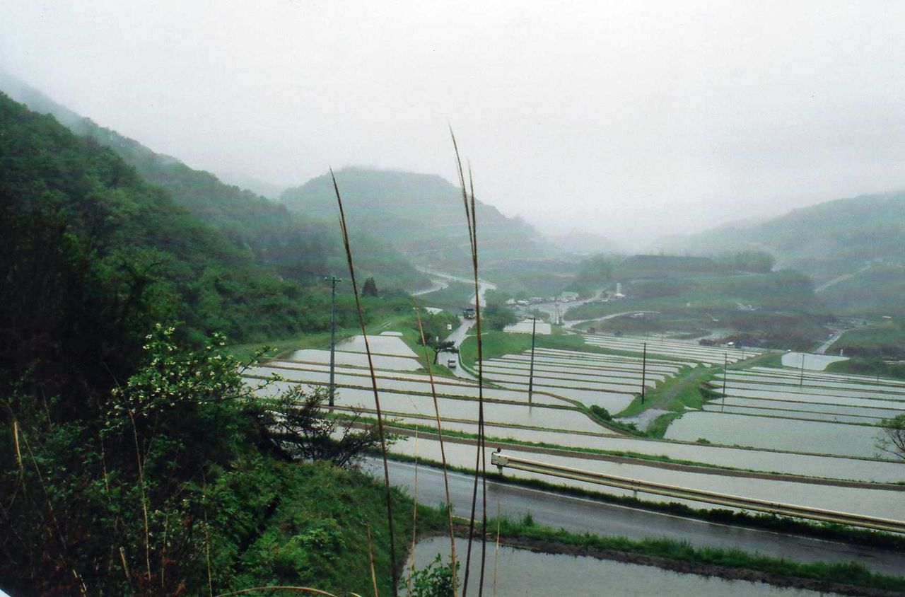 河内川に沿った道を進むと、小倉峠の手前で旧道と合流した。峠の向こうはダラダラ下りで、道は少し狭くなった。樹林を抜けると一面の棚田が拡がっている。世阿弥を始め、大勢の都人が通ったと伝える峠道から、見事と言える千枚田が見渡せた。近くには現在、小倉ダムが建設されており、将来この棚田はどうなるのかなと少し心配である。