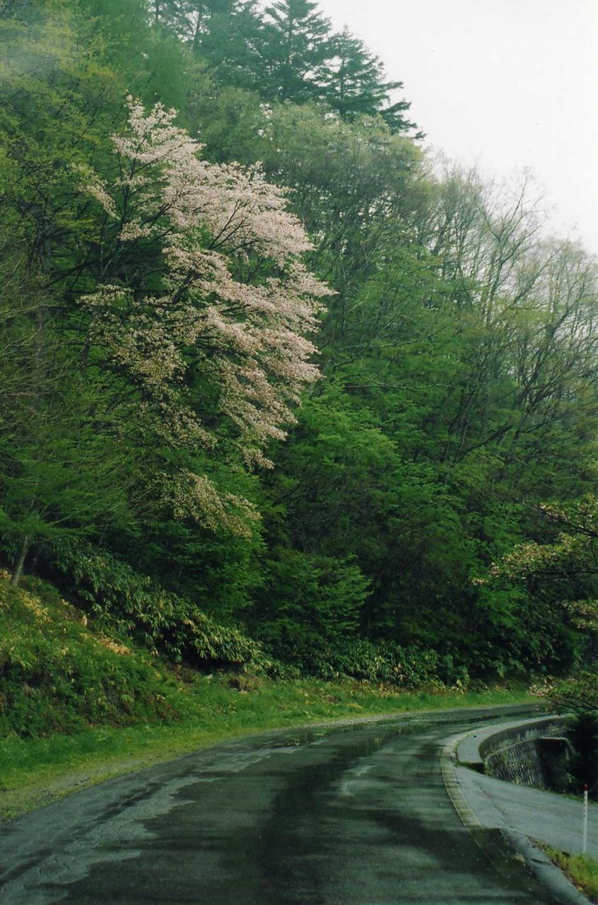 王滝川は相当に幅広い川に見えたが、水量は少なくて、河原は御岳から噴き出された黒色に近い岩石で一面に埋った感じである。川面と道路の高さが余り違わないので、土手の樹々に遮られて、王滝川の様子は、よくは見えなかった。いずれの方向も山が近くに迫って、青葉、若葉の緑が美しい。遠くに見える山々には薄い霧がかかって、とても幻想的である。