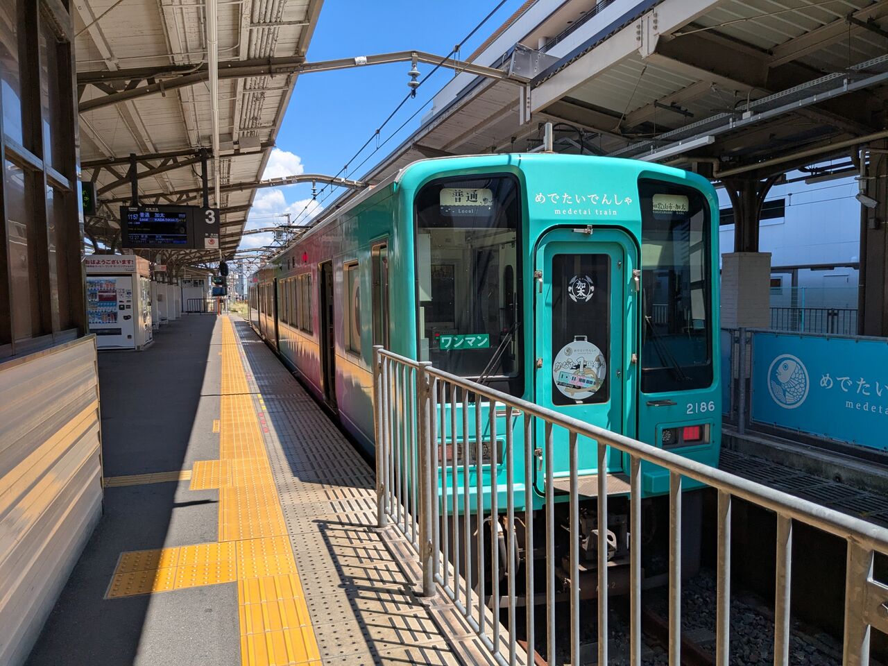 ホームに行くと昨年7月にデビューした、5台目のめでたいで電車「かなた」が停車していました。管理人も初めて見ます。過去・現在・未来をつなぐ希望の象徴で、虹色をしています。