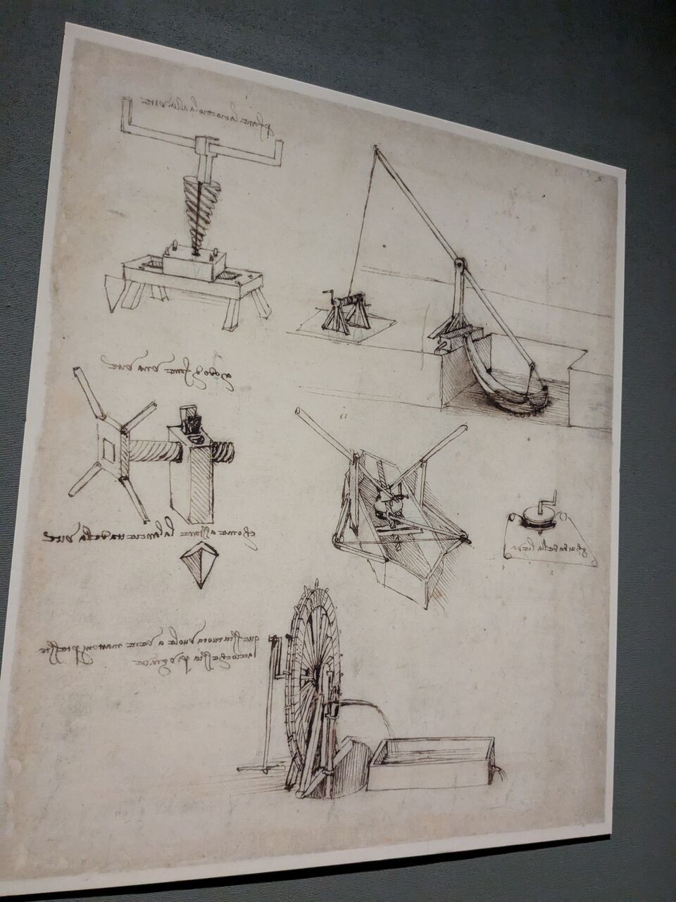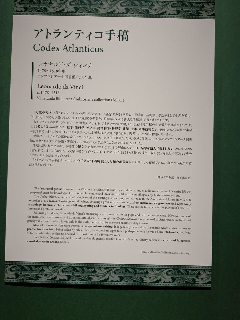 レオナルド・ダ・ヴィンチは生涯の40年に渡り、書き綴ってきたノートがあり、そのうち3分の1程度が現存します。その中で現在はミラノのアンブロジアーナ図書館に収蔵されている、デッサンと注釈からなる手稿集がアトランティコ手稿です。反転文字である鏡文字で書かれています。