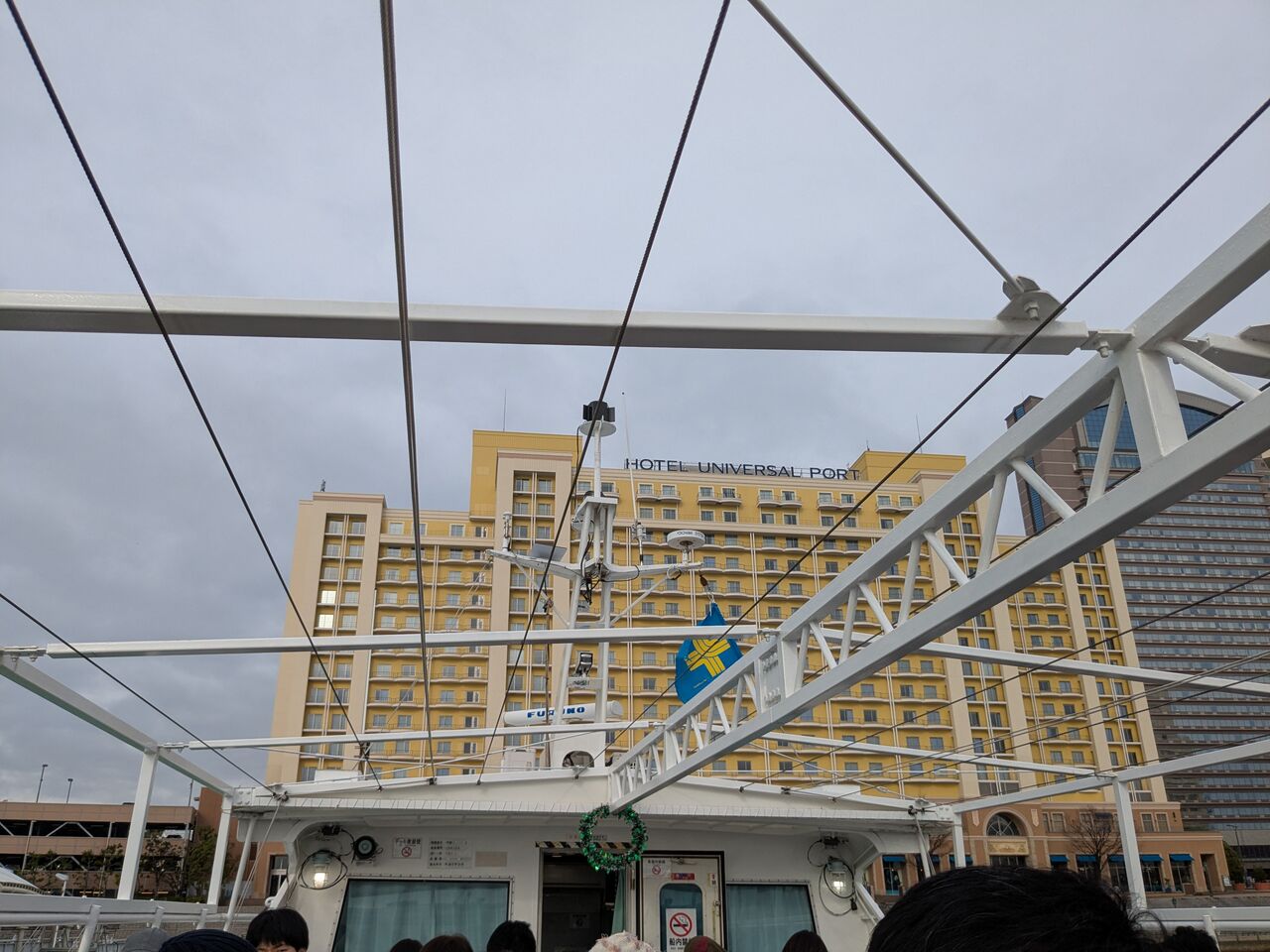 乗客を半分に分け、管理人は始めに2階の席になりました。船の2階から見たホテル