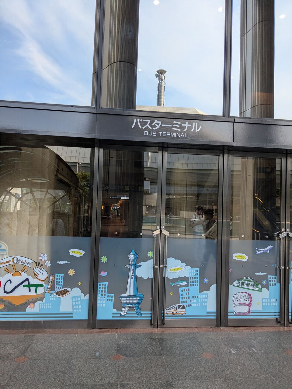 駅の上はショッピングセンターOCATがあり、西日本最大級のバスターミナルを有し、主に長距離バスが行き交います。