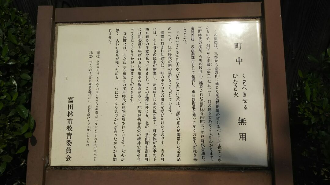 ここはかつて東高野街道と、富田林街道が交わる要衝であり、しかも石川がすぐ近くを流れるため、農産物、水に恵まれ、南河内一番の商業地として栄えた場所でした。しかも道標に書かれたように、街全体で火の用心に努めたため、300年以上も前の町並が現在でも目の当たりにすることが出来ます。