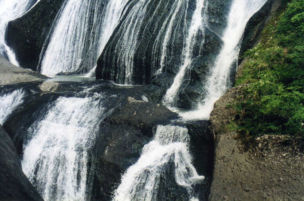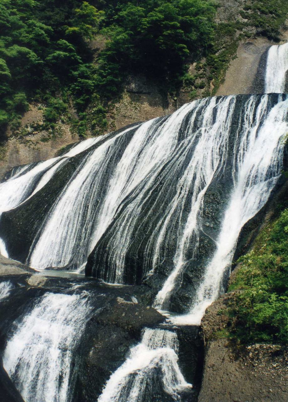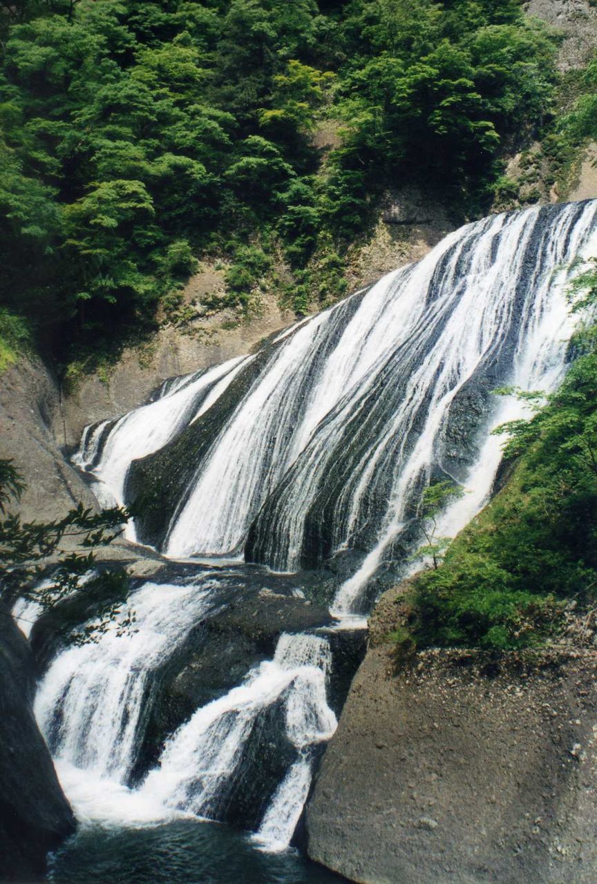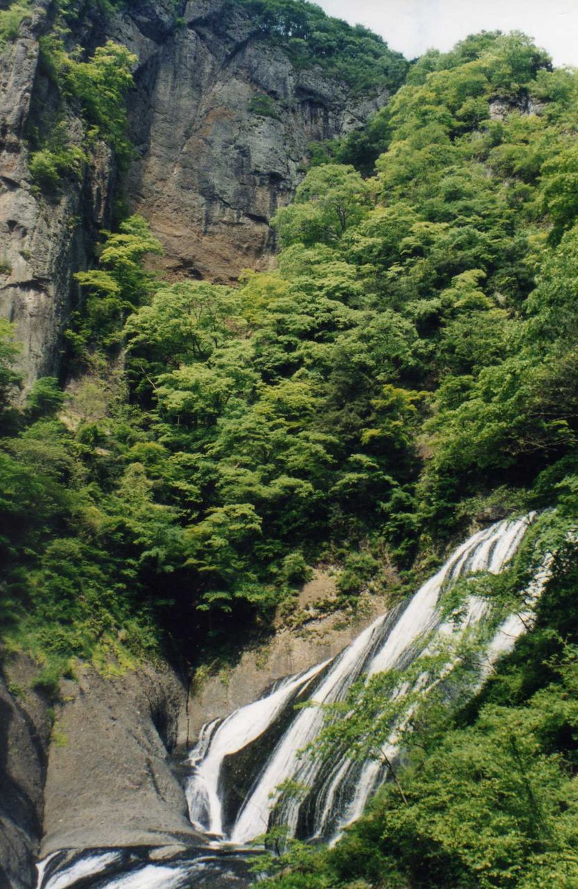 袋田に入って売店の駐車場に車を預けて、滝見物。平日だというのに、人出も少なくない。この滝は30数年も前になるが、その当時勤めていた会社の取引先が倒産し、会社更生法の申請をした後、土浦工場を訪れ、もう1人の担当者と一緒に見物したことがある。規模の大きな素晴らしい滝である。樹々に蔽われた道は崖の下が川の流れである。前方には生い茂る青葉の背面に、100メートル以上もあろうと思われる断崖絶壁が広がっている。私達の展望場所からは、丁度滝は、右上段から幾条もの白い糸を束ねて流したようで、巾の広さ、規模の大きさは屈指のものである。昔見た滝のイメージは、少しも変化していない。残念ながら大阪からは遠すぎるし、便利も悪い。関西の人達には馴染みが薄い。売店の人も和泉ナンバーは何処か知らなかったし、今度の旅行で、何人かの人に聞かれたのも不思議ではない。