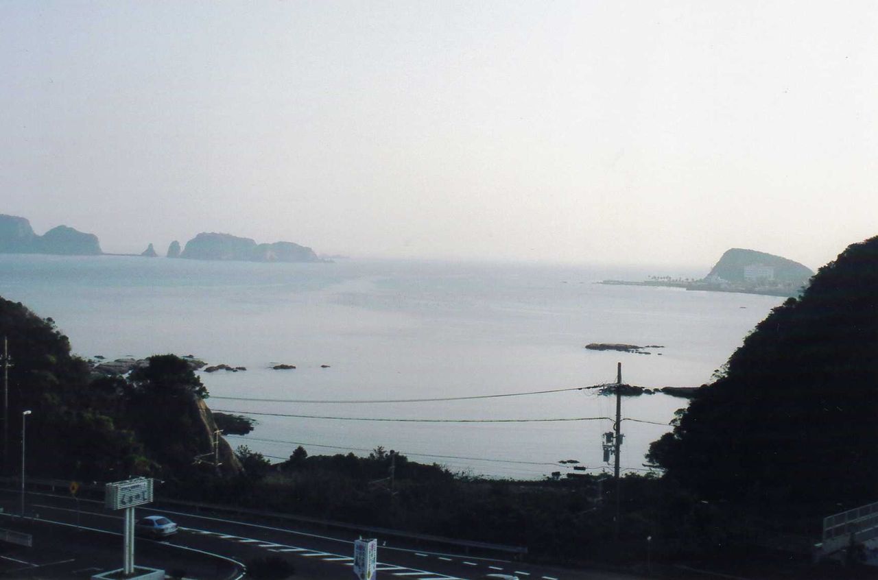 国民年金健康保養センターくまのじ荘(0735-52-3535)から、遙かに太地のキャッチャーボートを望むことが出来る。前は入江になっており、手前はJR紀勢本線と国道42号線が並行して走っている。幾つかの島が海に浮かんでおり、今日は波が静かだった。