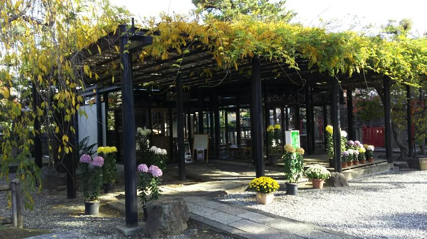 少し紅葉している樹木もありますが、このお寺は名前の通り「藤」の名所と知られ、見事な藤棚が目に付きます。しかし、現在は残念ながら季節外れです。下の方に写っている菊は綺麗でした。次回は初夏に再訪する必要がありそうです。その時は電車で‥‥。