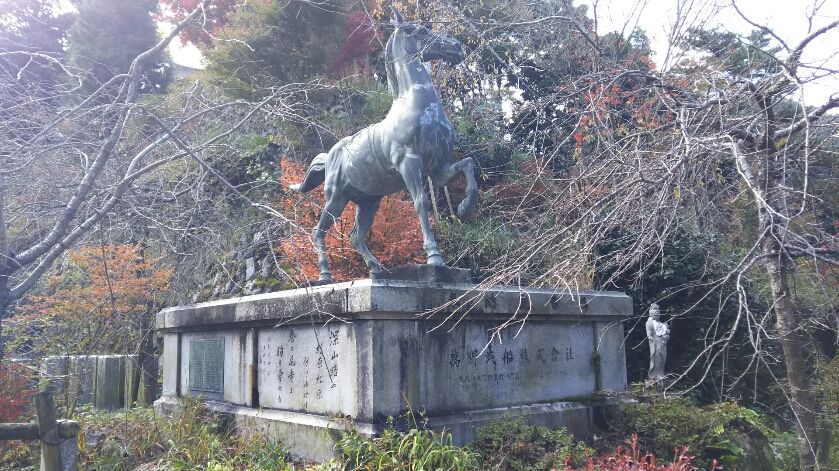 本堂にお詣りし、そのあと廻りを見渡すと、見事な紅葉と、馬の象があります。ベンチもあるのでここでやっと座ることが出来ました。馬の象はこの巡礼の中興の祖「花山天皇」を馬が道案内したという逸話に基づいています。
