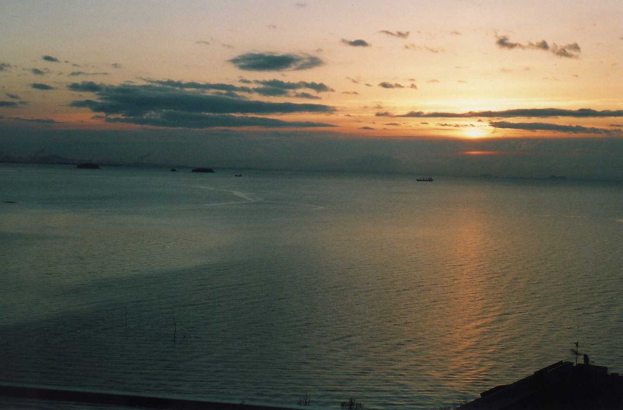 太陽は水平線からでなく、少し高い雲の間から顔を出した。空が赤く染まり、波に映る金色は何時の場合でも同じであるが、実に神々しく自然の真の姿を見せてくれる。小さな漁船が沖に見える。多分、早朝から漁に出た船だろう。空はみるみる明るくなる。今日は天気が良さそうである。