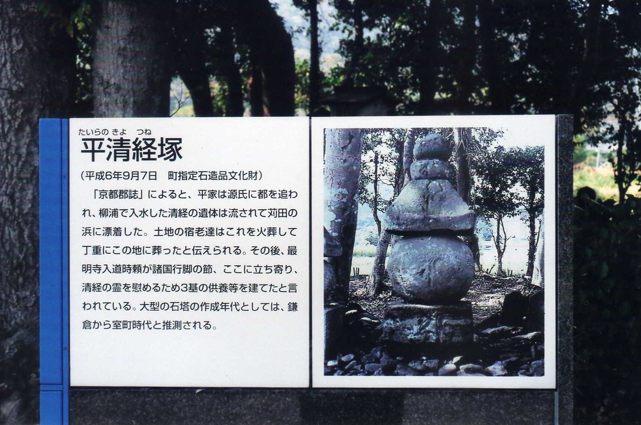 石塔は五輪塔三基と他に多くの一石五輪塔がある。源氏勢に追われた平重盛の三男、清経が柳浦で入水し、遺体が流されて苅田の浜に漂着したという。土地の人達が丁寧にこの地に葬ったと伝えている。平維盛、浜の宮沖入水と共に、清経柳浦入水は権力者の必衰、諸行無常の見本であるのかも知れない。南無阿弥陀仏‥‥。南無阿弥陀仏。