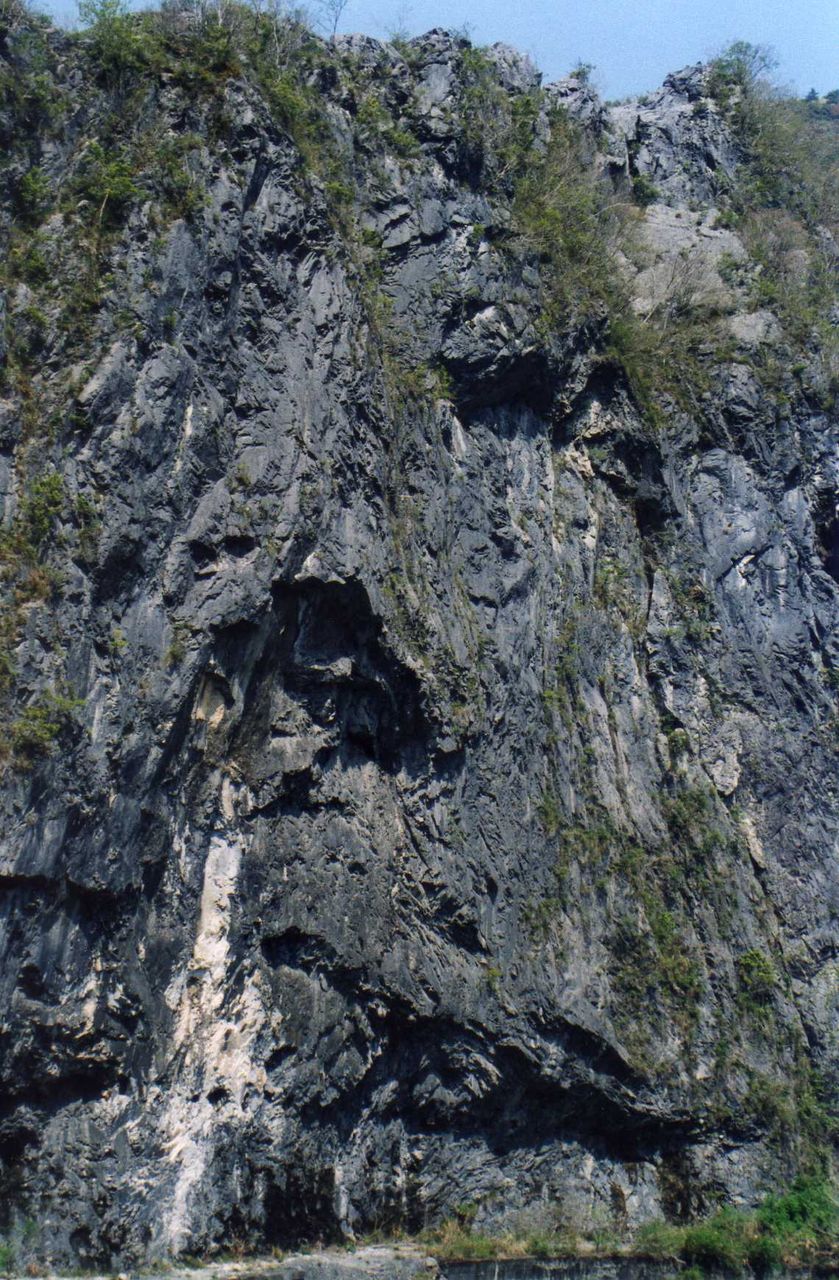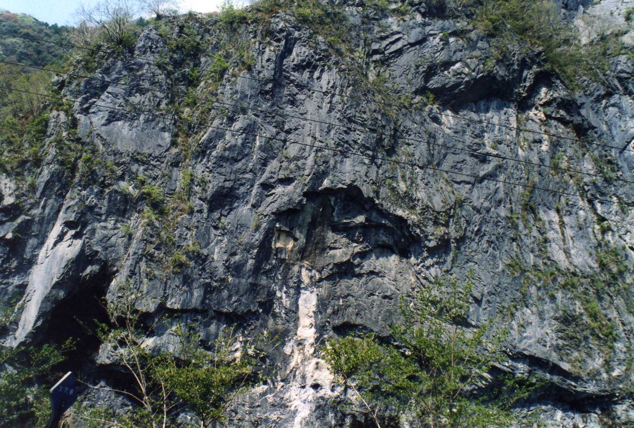 県道までUターンして樽の滝を目指す。舗装した新しい道を走る。途中、大穴峡で停車、和歌山県古座川町の千丈岩を思わせる一枚岩があり、岩の中程に大きな洞窟がある。大自然の力に驚く。