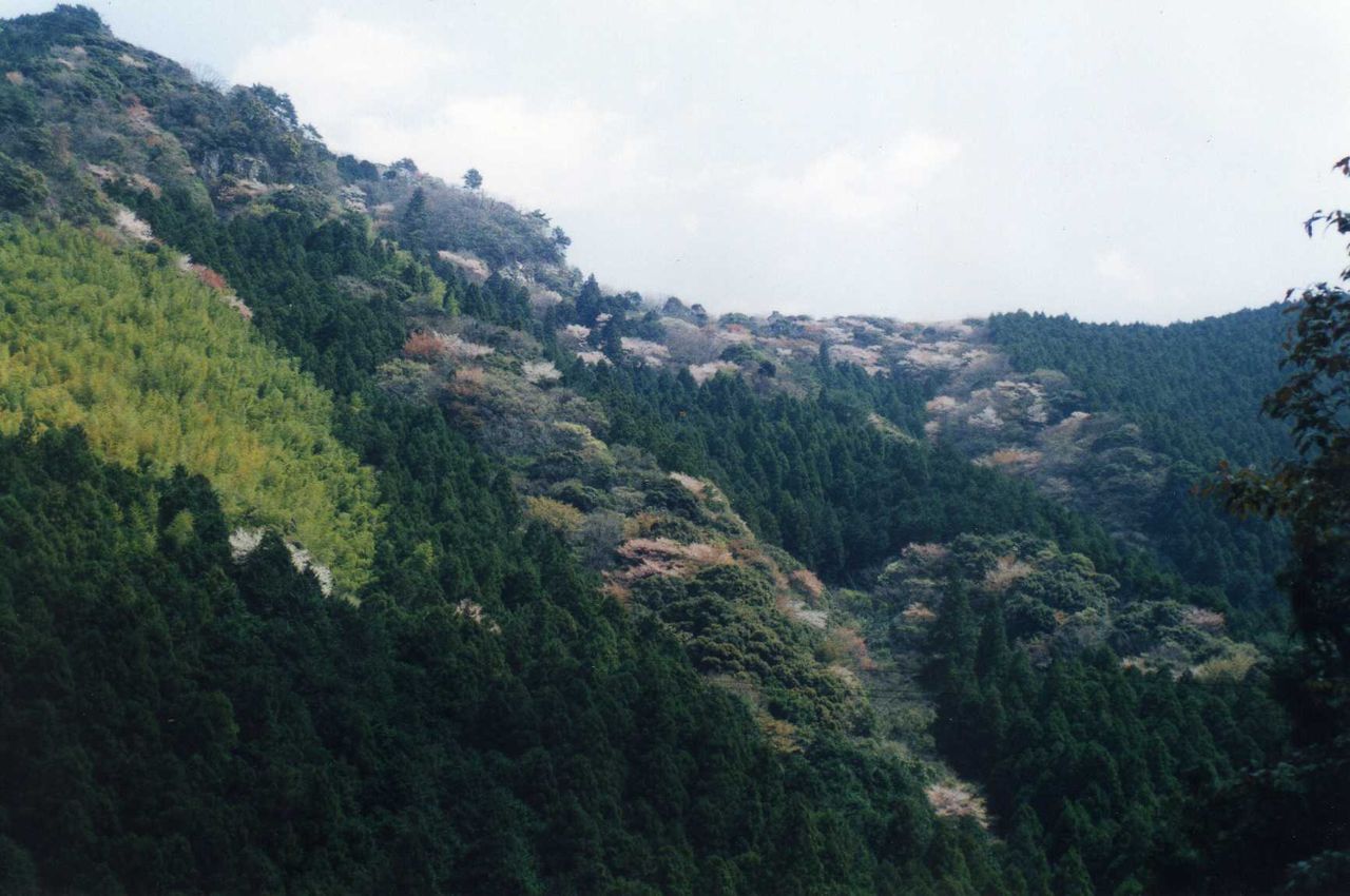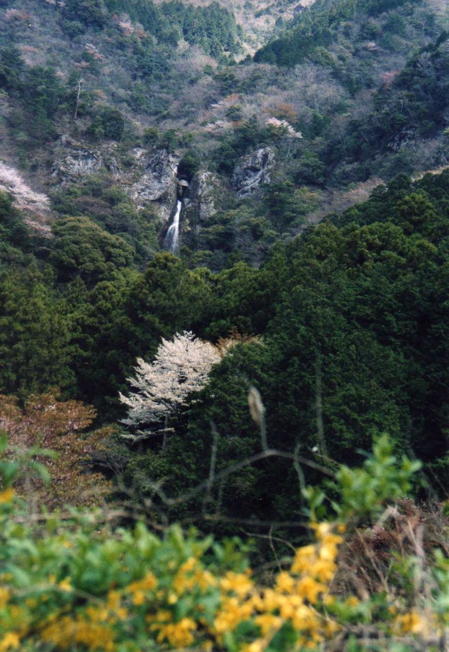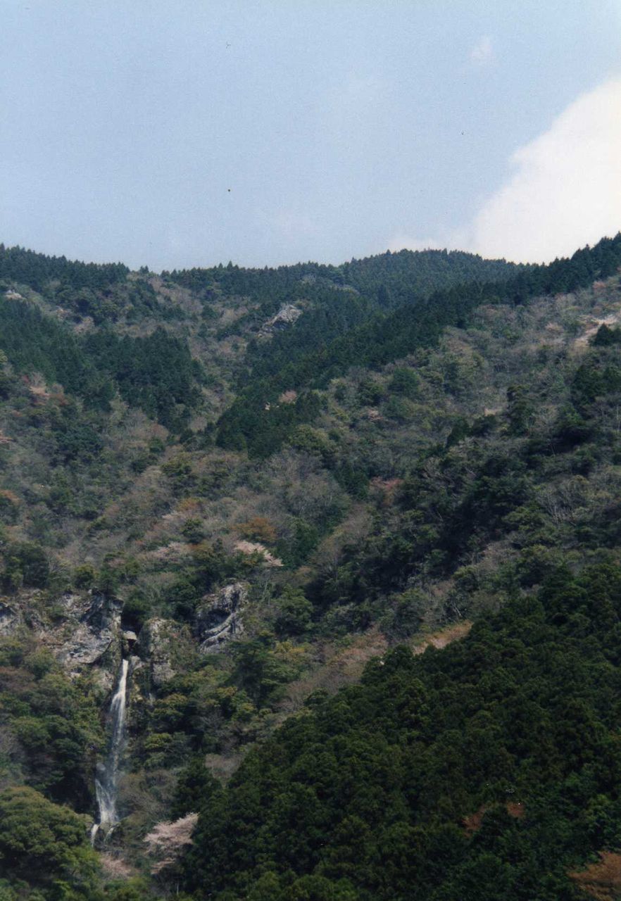県道から再び山道に入り、樽の滝入口の駐車場に着く。カーブの多い山道から向い側の山々の桜がよく見える。四国山地には多くの山桜が存在して、青葉とのコントラストが見事だ。